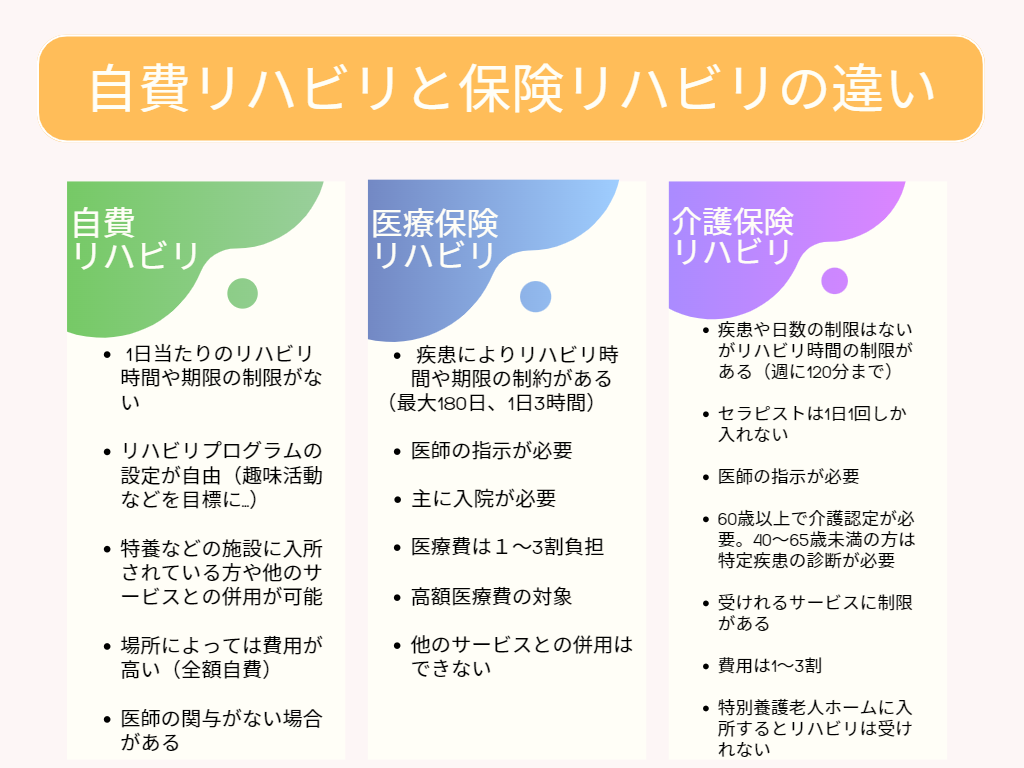 また「介護付き有料老人ホーム」、「特別養護老人ホーム」「グループホーム」と言った場所に入居されている方では介護保険を利用した訪問リハビリを利用することができないことがあります。