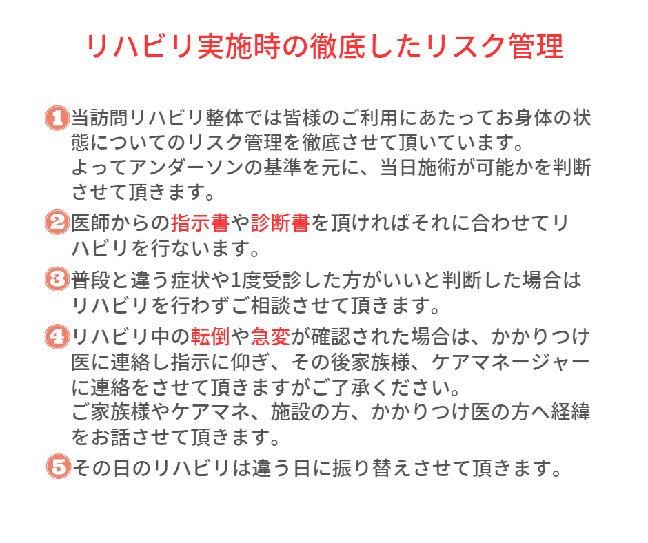 また、訪問リハビリ整体リ・サンテでは安心して当訪問自費リハビリ整体院を利用して頂くために、日本リハビリテーション医学会で発行されたジャーナル(The Japanese Journal of Rehabilitation Medicine)に記載されている以下の中指基準をもとに施術中のリスク管理を行わせて頂きます。