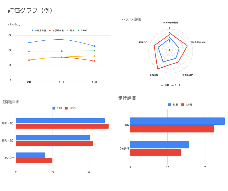 ※またお身体の関節や筋肉の状態、バランス能力を数値化し、そのリハビリデータは後日グラフを作成しお渡しさせて頂きお身体についてお伝えさせて頂きます。