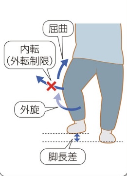 疼痛が増加すると『股関節を内に捻る』ことや『曲げすぎる』ことで、脱臼するリスクを伴う人工骨頭全置換術と言う手術を行う場合も多くあります。手術後はリハビリ病院でリハビリを行なう必要があります。