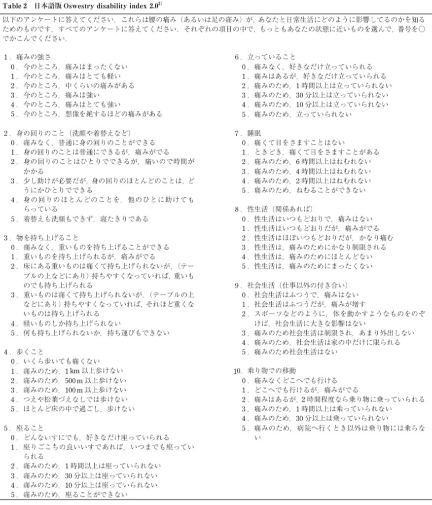 腰痛や下肢痛による日常生活活動(ADL)障害を評価する自己記入式の評価となっており、世界でも広く用いられている評価scaleとなっています。