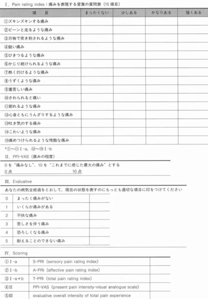 SF-MPQは痛みの感覚、感情、評価の次元を評価する多次元的なツールであり、3つの部分から構成されています。