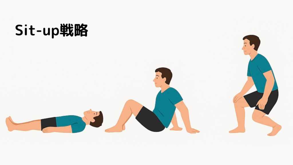 - Sit-up法のような高難度動作には、臀筋・大腿四頭筋・腸腰筋の筋トレが必要